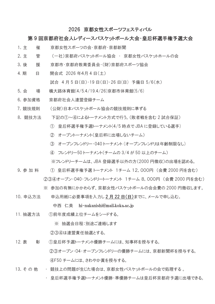 平素より、京都府社会人バスケットボール連盟ならびに京都女性バスケットボールの会にご理解、ご参加を頂きありがとうございます。