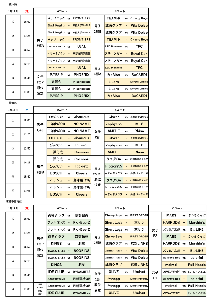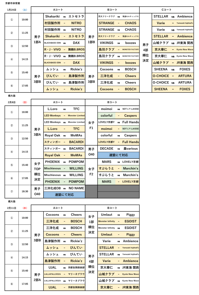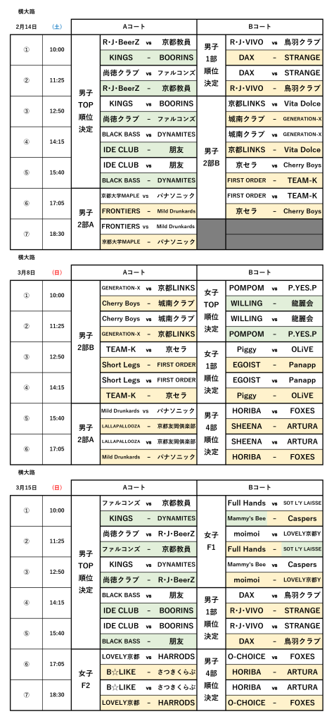 ※第3.0版改定箇所:男子1部 A・Bの順位が確定したため、2/14(土)以降の順位決定戦の日程を更新しました。